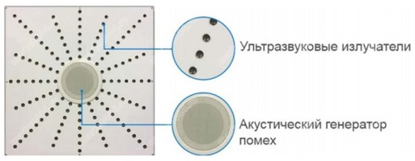 Защищает запотолочное пространство. Еще один динамик является внешним. Он размещается за потолочной плиткой и защищает пространство за потолком от возможных скрытых микрофонов и диктофонов.